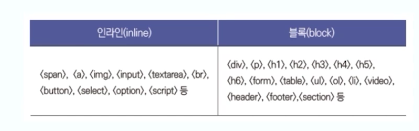 - block : 행 전체에 자리를 부여해서 글자가 행을 모두 사용하지 않아도 한 행을 해당 태그가 모두 차지한다.
